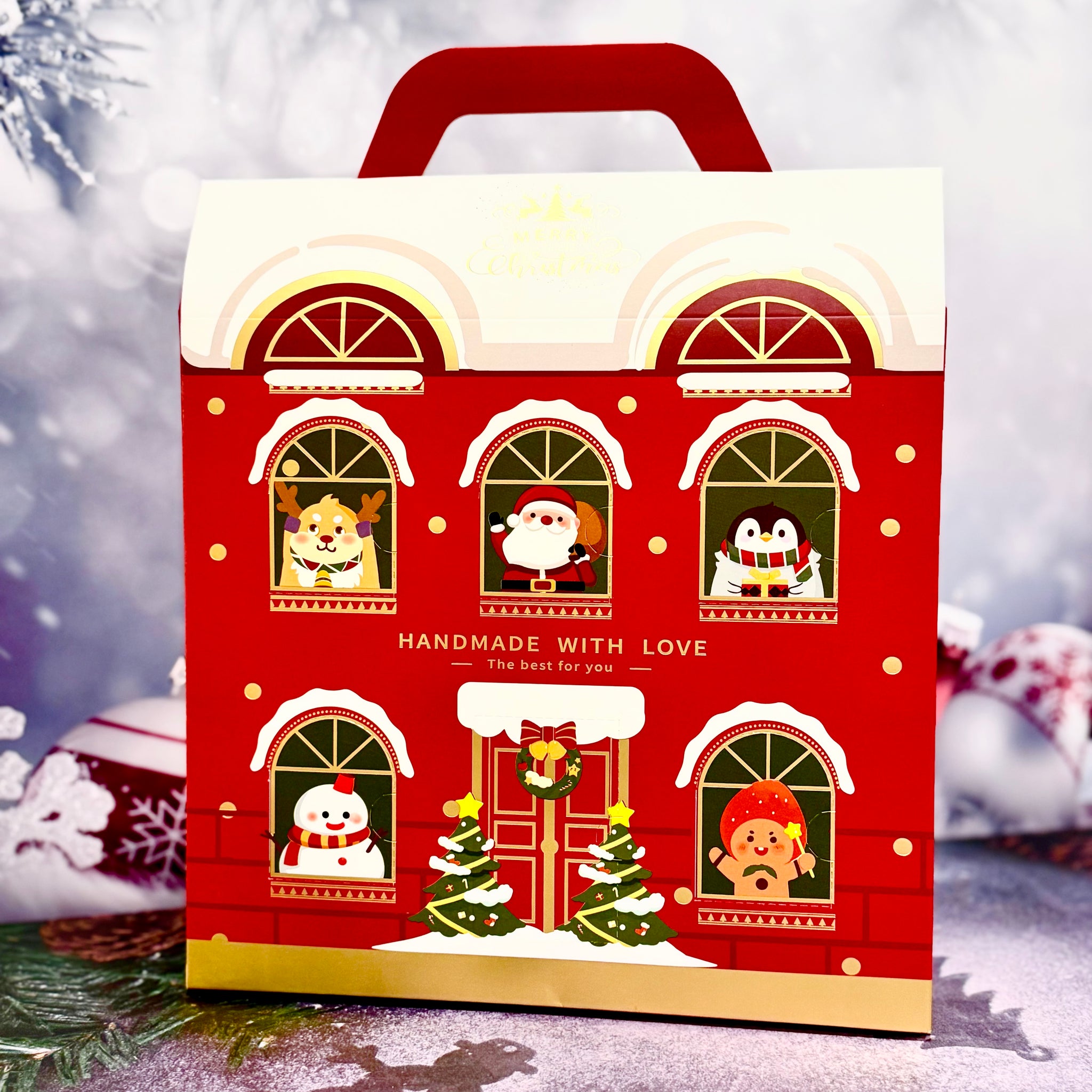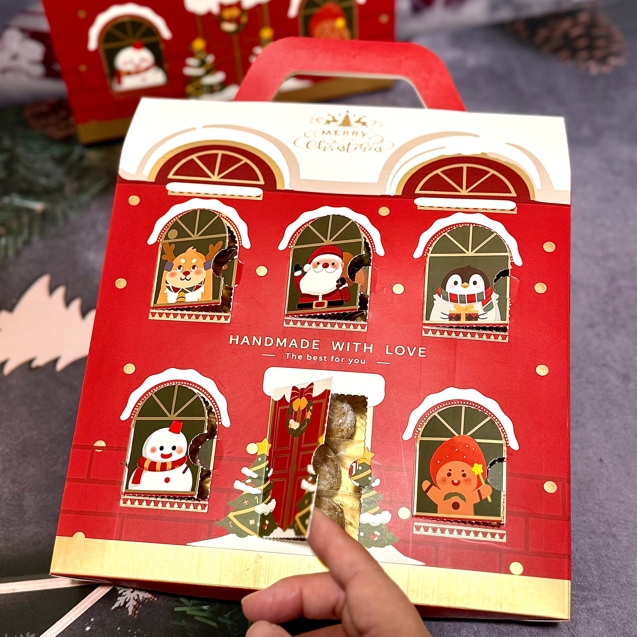 Peek into the festive magic! This charming vintage red box, adorned with whimsical windows, holds 18 handcrafted cookies - each one a delightful surprise. Discover a merry assortment of Cashew, Pistachio, Walnut, Almond Snowball, Classic Snowflake and Oreo Snowflake cookies, all crafted to sweeten your holiday moments.